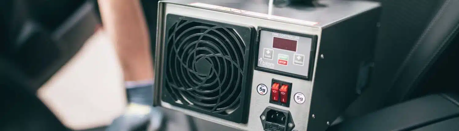 Bei der effektiven Ozonbehandlung für Fahrzeuge in München wird ein Ozon-Generator im Innenraum des Fahrzeugs platziert. Der Generator produziert Ozon, das dann durch die Luftzirkulation im Auto verteilt wird, um verschiedene Gerüche und Schadstoffe abzubauen.